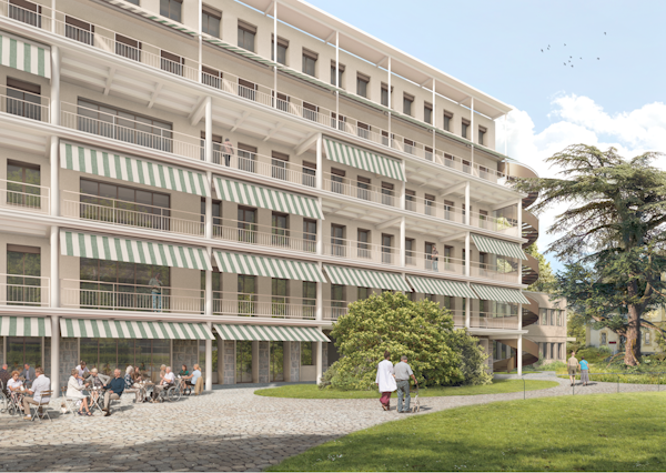 L’enveloppe du bâtiment sera conservée, notamment la façade historique sud, qui sera rénovée. L’aménagement intérieur et le choix des matériaux ont été soigneusement réfléchis, afin de créer un environnement accueillant et fonctionnel, en respectant à la fois le caractère patrimonial du site du Samaritain, les exigences du secteur de la santé et les engagements de durabilité portés par l’HRC.