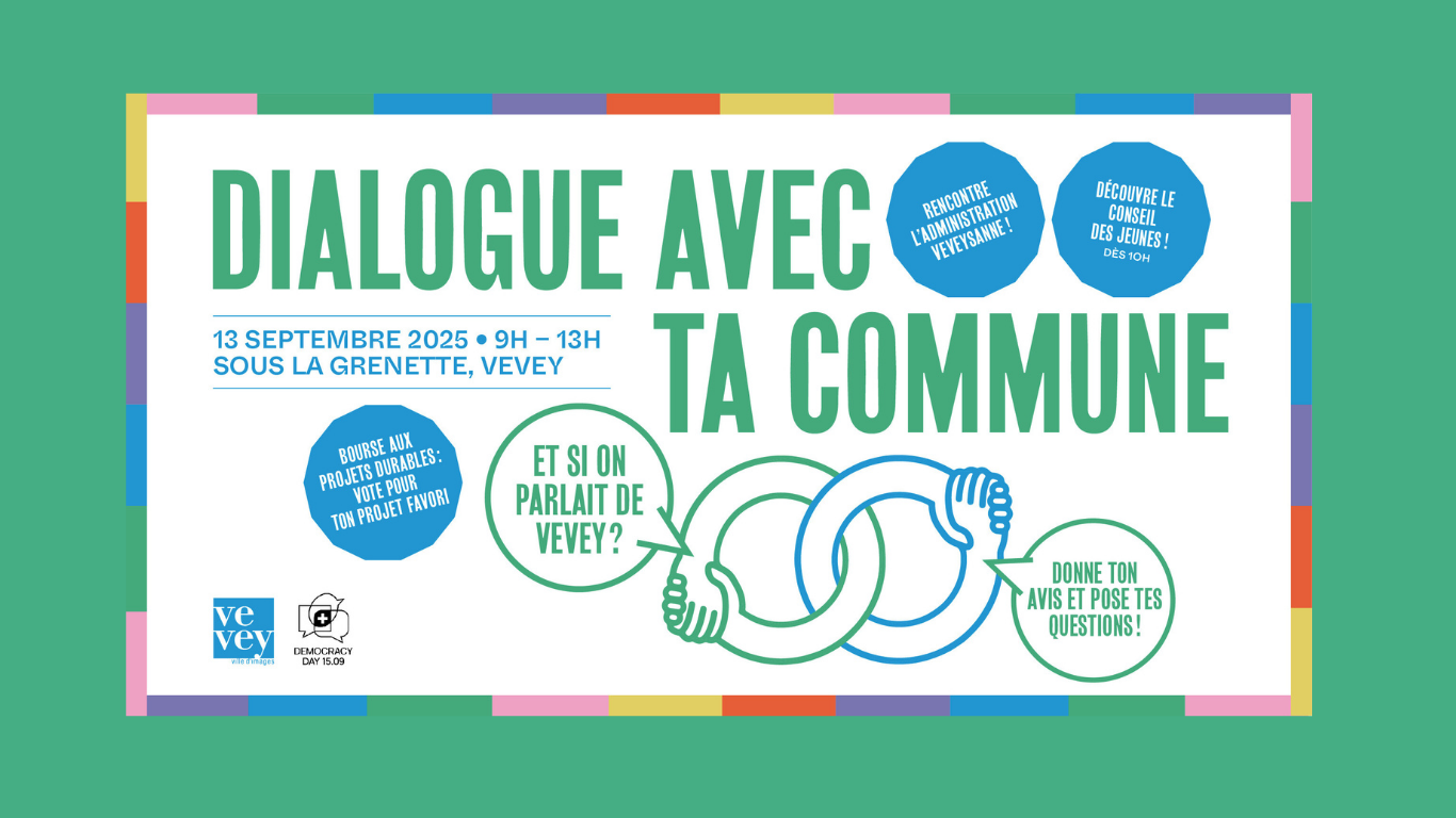 Dans le cadre de la Journée de la démocratie, la Ville de Vevey invite sa population à participer à l’événement « Dialogue avec ta Commune », qui se tiendra samedi 13 septembre prochain, de 9h à 13h sous la Grenette. Ce moment d’échange et de convivialité a pour objectif de permettre aux habitantes et habitants de s’exprimer sur leurs envies d’implication dans la vie locale, tout en renforçant leur compréhension du système politique, ainsi que leur connaissance des prestations et des projets portés par l’administration communale et les associations locales.