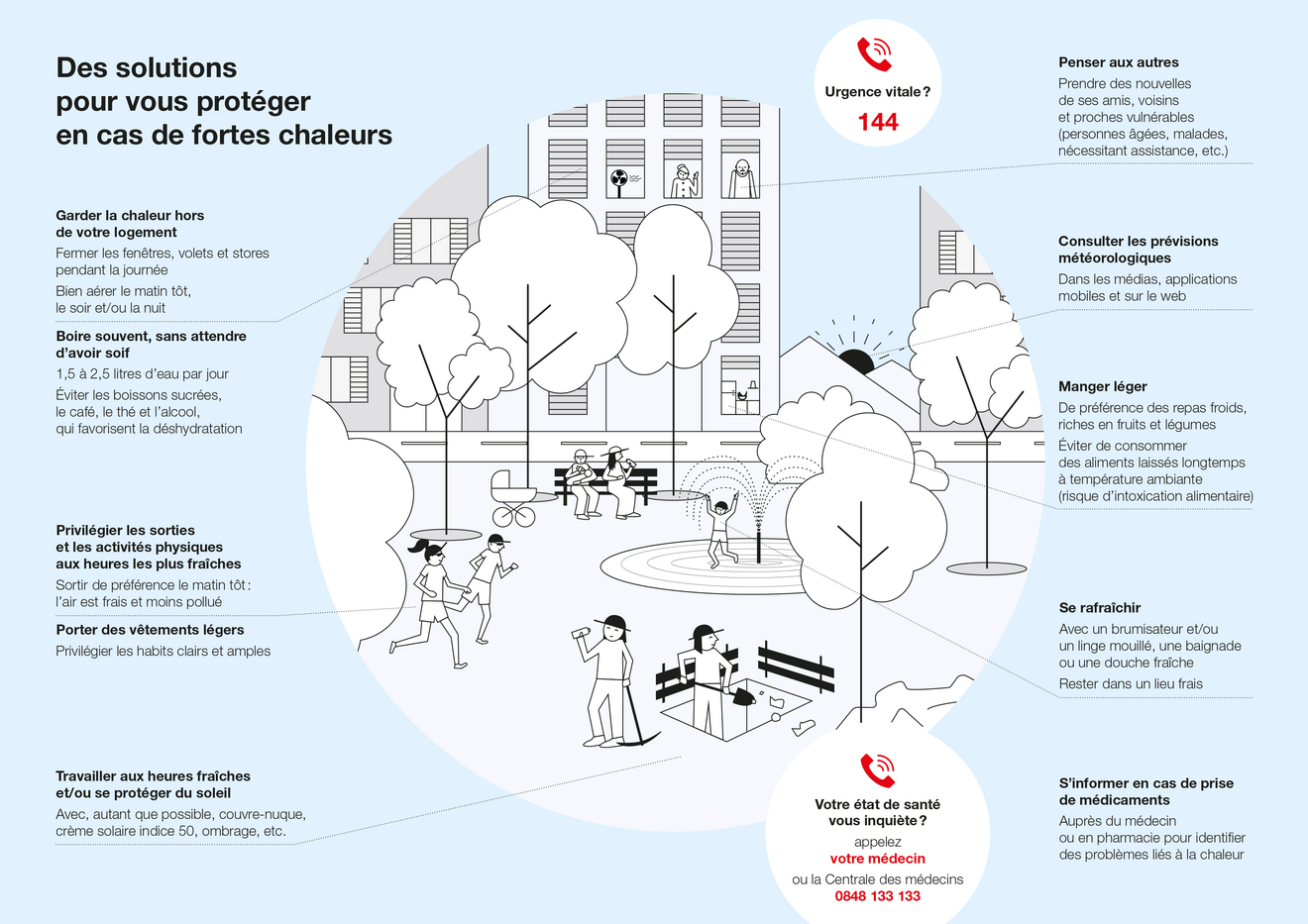 - appeler le médecin traitant ou la centrale des médecins de garde en cas de malaise (0848 133 133) ou le 144 en cas de danger vital.