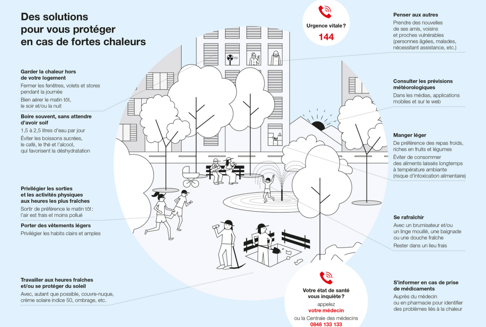 La vigilance reste toutefois de mise, car des problèmes de santé consécutifs aux journées de canicule peuvent se présenter ultérieurement. En cas de malaise, de doutes ou de questions sur son état de santé, il est conseillé d'appeler le médecin traitant ou la Centrale téléphonique des médecins de garde qui est à disposition de la population au numéro 0848 133 133.