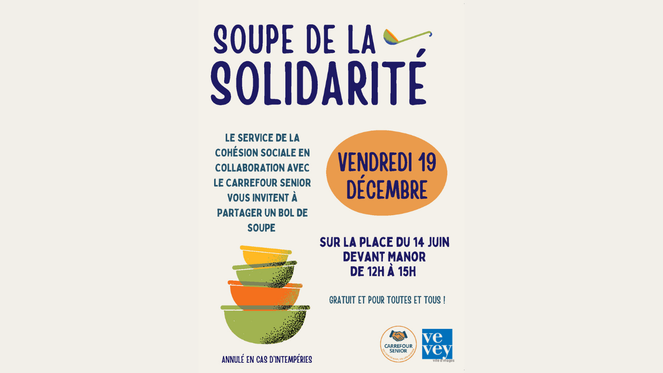Ce vendredi 19 décembre, le Service de la cohésion sociale veveysan invite la population à partager une soupe de 12h à 15h, sur la place du 14-juin à l’occasion de la Journée internationale de la solidarité.
